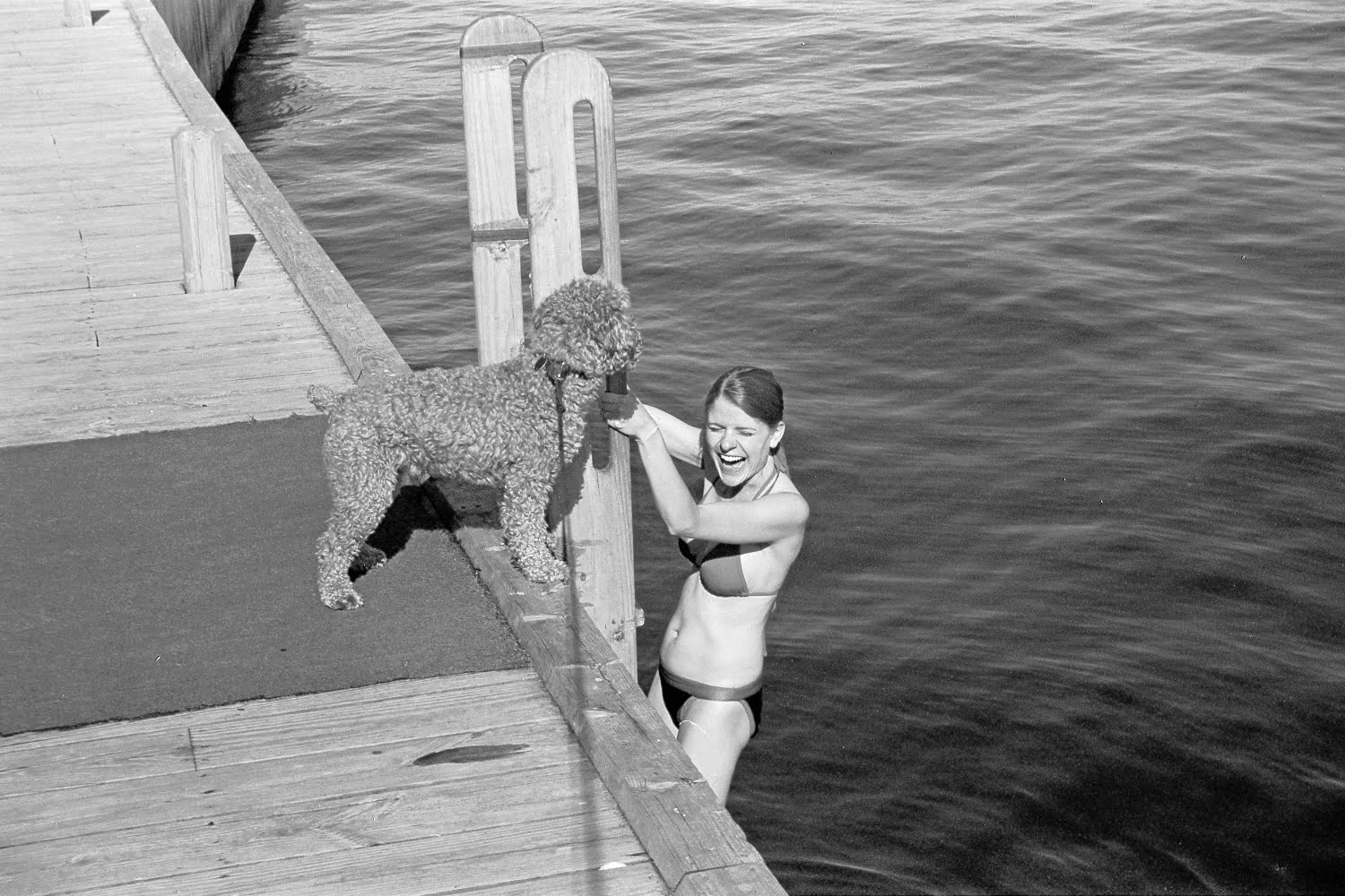 Now here's an interesting one for sure. It's a beautiful vista of the Catskills. With Rocco bravely leaping off of Giant Ledge Slide Mountain. Pretty cool how the blue sky blends with the river water, and how the green rocky shallows are revealed in the shadow on Tommy's back, nearly merging with the greens of the pine tree in the background. Neat.